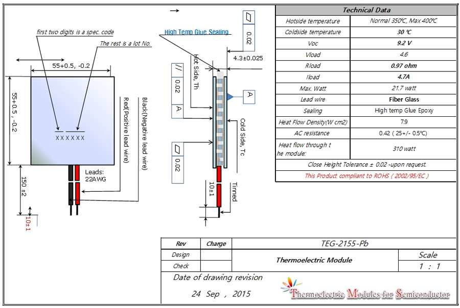 본 열전소자는 고온부가 400℃를 넘지 않는 핫플레이트에 부착하여 발전이 가능한 환경에 사용하시는 열전소자이고 저온부를 구현하실 때 공랭식 냉각팬과 방열기를 사용하시는 것 보다는 30℃ 이하의 순환 냉각수를 사용 하시면 꾸준한 내구성을 나타냅니다.